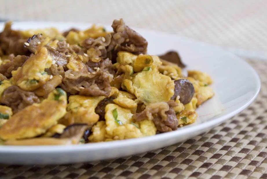cogumelos ostra cinzentos; ovos, pimentos vermelhos e ou verdes; cebola; bacon (facultativo); alhos; azeite; sal e pimenta; molho de coentros.