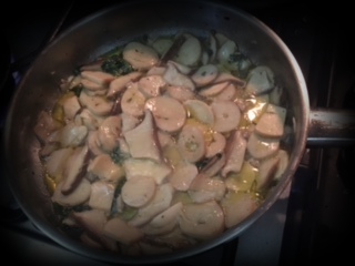 Laminar os cogumelos, cortar a cebola e o alho francês às rodelas, e reservar.