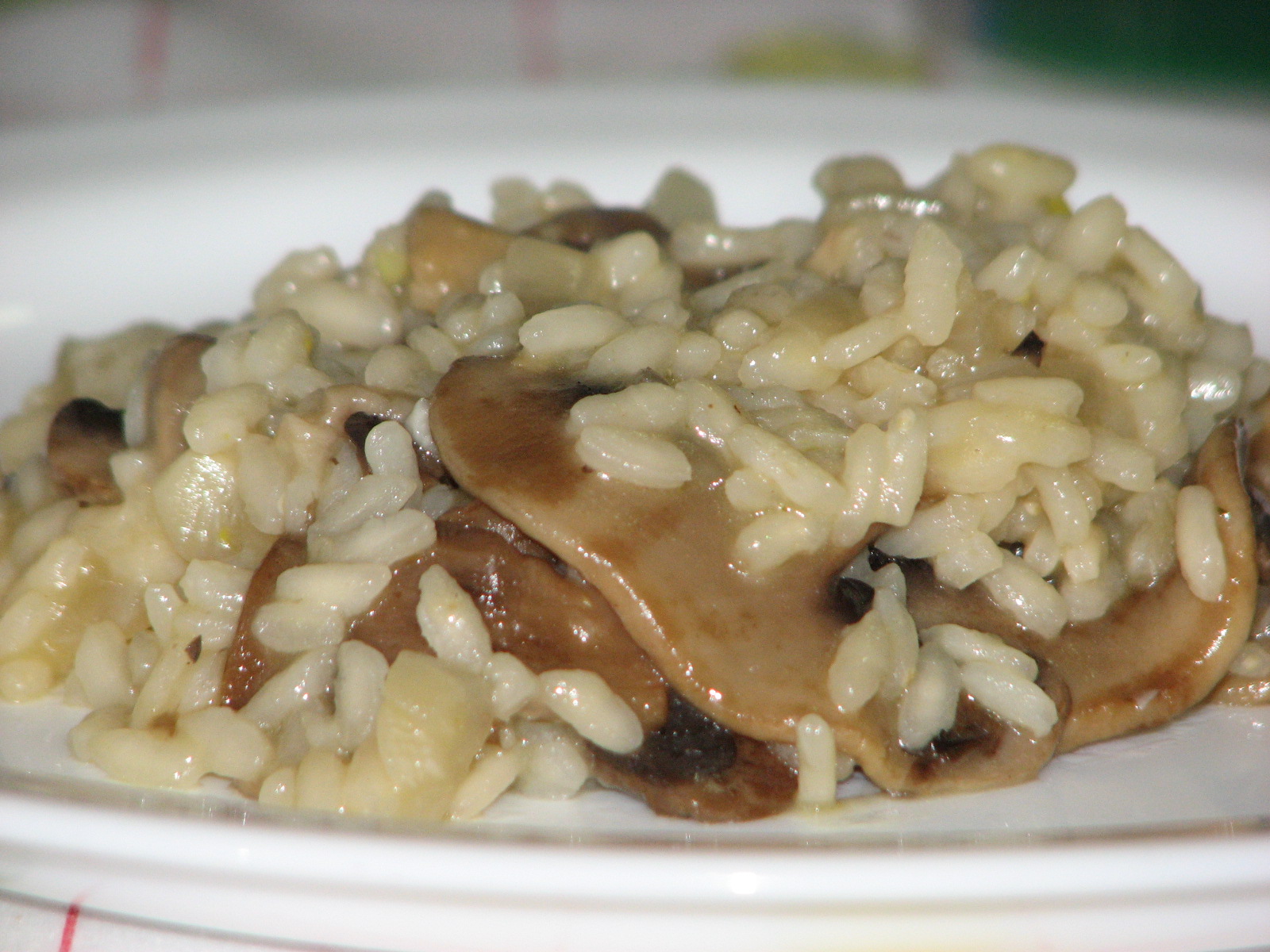 arroz arbóreo (risoto); cogumelos ostra cinzento; bacon; peito de frango (facultativo); cebola; alhos; vinho branco; azeite; manteiga (margarina culinária); queijo ralado (mozarella); sal e pimenta.