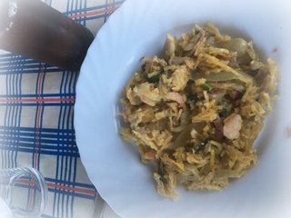 Pleurotus/cogumelos ostra; bacon ou gambas; cebola; alhos; alho francês; batata palha; ovos; salsa; azeite;sal e pimenta.